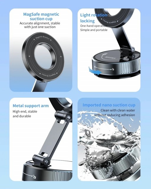 bilholder sammenleggbar med sugekopp MagSafe - svart bilholder sammenleggbar med sugekopp MagSafe - svart kompakt og sammenleggbar bilholder for håndfri navigasjon i bil, hjemme eller på kontoret. PrisNOK199,00 inkl. mva. På lager Antall Kjøp Ønskeliste Artikkelnr.: S-1004331 Produsent: Eazy Del dette Produktinfo Produktanmeldelser (0) Den magnetiske mobilholderen er en kompakt og sammenleggbar løsning for håndfri navigasjon i bil, hjemme eller på kontoret. Den bruker kraftig vakuum-sugekoppteknologi og magnetisk feste for å holde smarttelefoner sikkert på plass på dashbord, frontruter eller andre glatte overflater. Nøkkelfunksjoner 360-graders rotasjon: Holderen har et kuleledd og en to-akset folding-arm som lar deg rotere telefonen 360 grader horisontalt og justere den vertikalt for optimal visningsvinkel.Vakuum-sugekopp: Benytter en roterende låsemekanisme som skaper et kraftig vakuum-feste på glatte overflater som frontruter, dashbord (glatte), speil eller fliser. Magnetisk feste: Spesielt designet for iPhone-modeller med MagSafe (iPhone 12 og nyere), men inkluderer en metallring for å støtte Android-enheter og eldre modeller.Sammenleggbart design: Når den ikke er i bruk, kan holderen legges helt sammen til en kompakt størrelse, noe som gjør den enkel å oppbevare eller ta med seg på reise. Spesifikasjoner - Forlenget høyde: 126 mm - Dimensjoner: 62 mm diameter × 40 mm høyde - Sugekopptrykk: 18-65 kPa - Vakuumadhesjonskraft: 5 kg - Magnetisk tiltrekningskraft: 20 N- Materialer: Nano / PC / ABS / TPU / sinklegering- Kompatibilitet: Magnetiske telefoner og etuier (inkluderer selvklebende magnetisk plate for ikke-magnetiske enheter) Skriv en produktanmeldelse og del dine erfaringer med dette produktet med andre kunder. Email Navn Din vurdering? 1 star 2 star 3 star 4 star 5 star 6 star Oppgi en tittel for anmeldelsen din Skriv inn produktanmeldelsen i feltet under