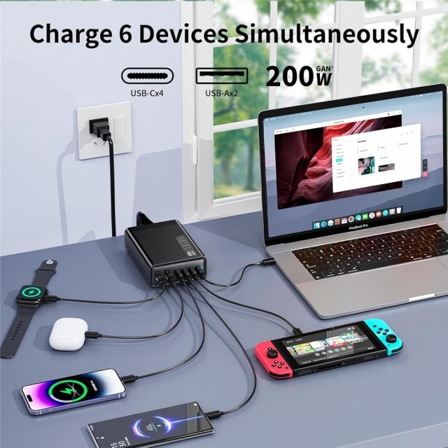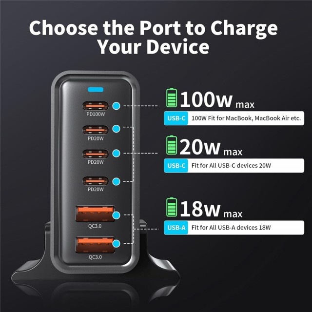 GaN 200W USB-C-ladestasjon 6 Porter 4xUSB-C, 2xUSB-A - Svart GaN 200W USB-C-ladestasjon 6 Porter 4xUSB-C, 2xUSB-A - Svart En kraftig og allsidig ladestasjon som fungerer som et sentralt knutepunkt for alle enhetene dine. PrisNOK389,00 inkl. mva. Utsolgt Ønskeliste Artikkelnr.: T-1000232 Produsent: Eazy E-postvarsling Vi beklager, men produktet er midlertidig utsolgt. Legg igjen din e-postadresse og vi vil sende deg en melding så snart varen kommer tilbake på lager igjen. Jeg godtar vilkårene Registrer Del dette Produktinfo Produktanmeldelser (0) Med denne kraftige USB-tårnladeren får du en komplett ladeløsning for alle enhetene dine. Laderen har totalt 6 porter – 4 x USB-C og 2 x USB-A – og leverer opptil 200 W samlet effekt, slik at du kan lade flere enheter samtidig uten å gå på kompromiss med hastighet eller ytelse. Hver USB-C-port støtter Power Delivery (PD) og tilpasser automatisk spenning og strøm etter hvilken enhet som er tilkoblet. Det gir rask og trygg lading – enten det er en smarttelefon, et nettbrett, en bærbar PC eller trådløse hodetelefoner. USB-A-portene støtter også hurtiglading. Med beskyttelseskretser mot overstrøm, overspenning, overoppheting og kortslutning Nøkkelfunksjoner: - Total effekt: 200W total utgangseffekt fordelt på 6 porter. - GaN-teknologi: Bruker galliumnitrid, som gjør laderen mindre, mer effektiv og kjøligere enn tradisjonelle silisium-ladere. - Port-oppsett: 3x USB-C : (PD) For moderne enheter og hurtiglading. 2x USB-A : For eldre kabler og tilbehør hurtiglading. - Toppfart: Én enkelt USB-C-port kan levere opptil 100W, noe som er nok til å lade en MacBook Pro eller andre kraftige laptoper i full hastighet. Spesifikasjoner Type: USB-ladestasjon Effekt: 200 W Inngang: 240 V, 50/60 Hz Porter: 4 x USB-C 100W x 1 og 20W x 3 (PD), 2 x USB-A (18W x 2) Størrelse: 95 x 65 x 30 mm Godkjenninger: CE, RoHS Skriv en produktanmeldelse og del dine erfaringer med dette produktet med andre kunder. Email Navn Din vurdering? 1 star 2 star 3 star 4 star 5 star 6 star Oppgi en tittel for anmeldelsen din Skriv inn produktanmeldelsen i feltet under